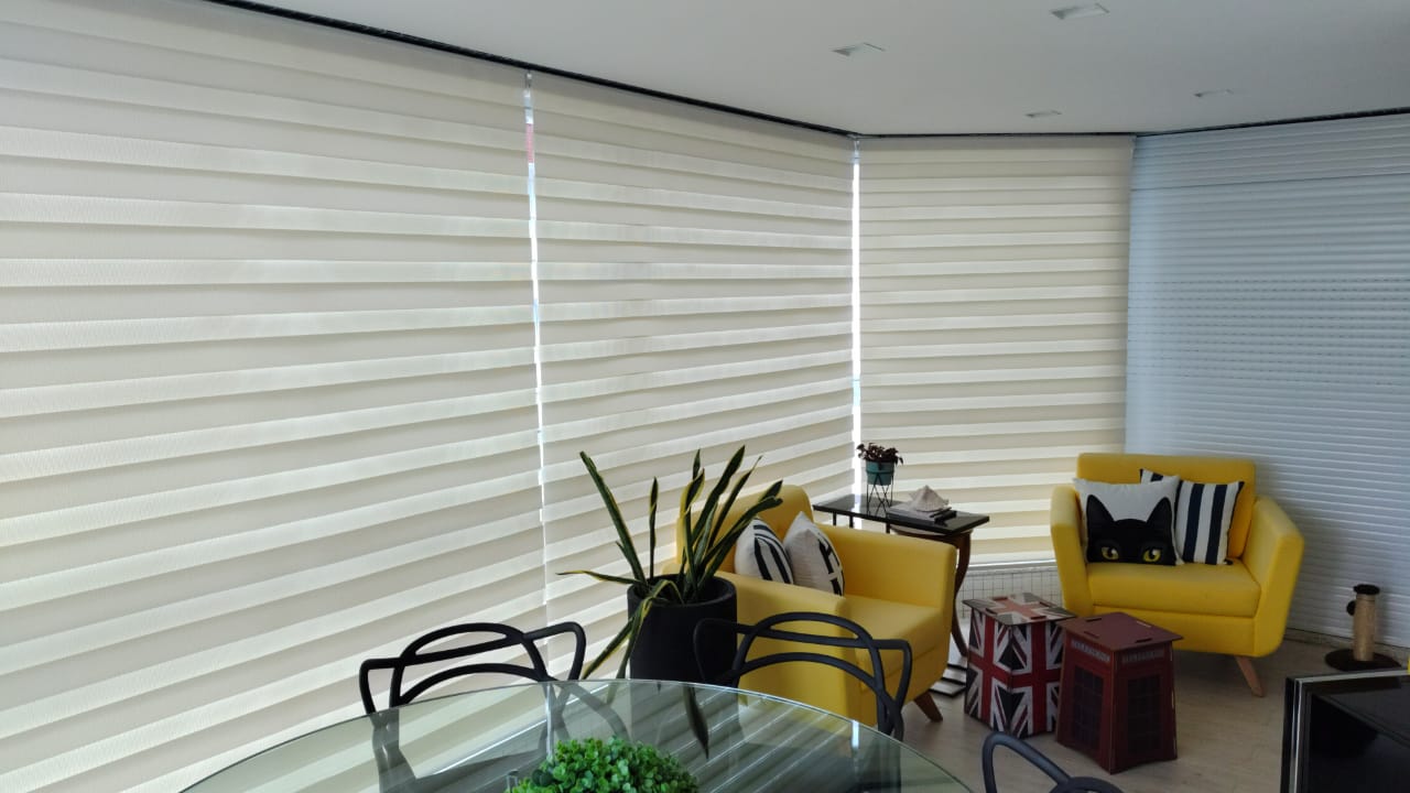 Possui o mesmo acionamento da cortina Rolô, porém apresenta dois tecidos girando no tubo em sentidos opostos.